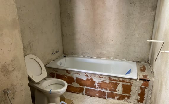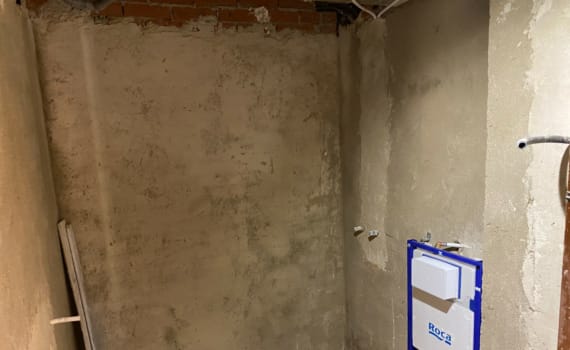 Posteriormente, tuvimos que nivelar y aplomar el soporte con un mortero de cemento para un buen agarre de todos los nuevos sanitarios. Este es el procedimiento que manda el fabricante para poder instalar correctamente el azulejo. En el caso de esta vivienda, las paredes existentes carecían de dicho soporte de mortero.