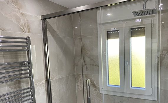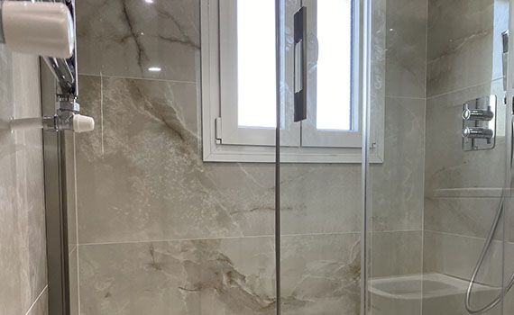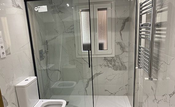 En esta reforma la característica principal que destaca es la grifería de Ramon Soler para las duchas las cuales van «empotradas» y ocultas dentro de la pared ; lo cual conseguimos mayor estética y limpieza en el acabado final.