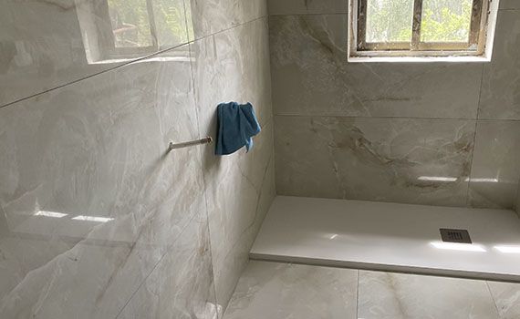 En esta ocasión el cliente ha elegido un material cerámico de gran formato porcelánico y rectificado de azulejos Peña, para evitar las menos juntas posibles. Y para darle continuidad se coloca el mismo material para suelo y paredes ya que está adecuado para ello.
