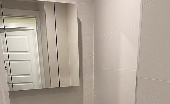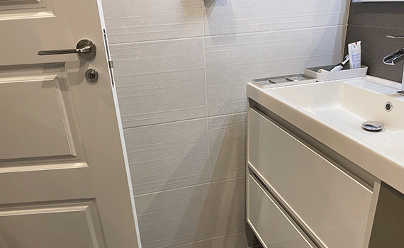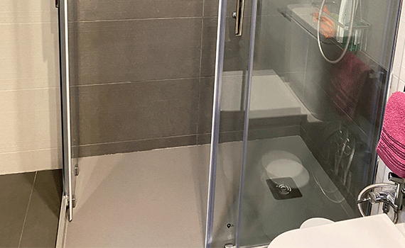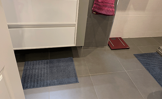 Tras la aplicación del soporte sobre el cual colocar el azulejo porcelánico este fue solado con la ayuda de herramientas mecánicas auto-nivelantes. Gracias a ello podemos conseguir una colocación perfecta aplomada de material cerámico de gran formato.