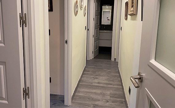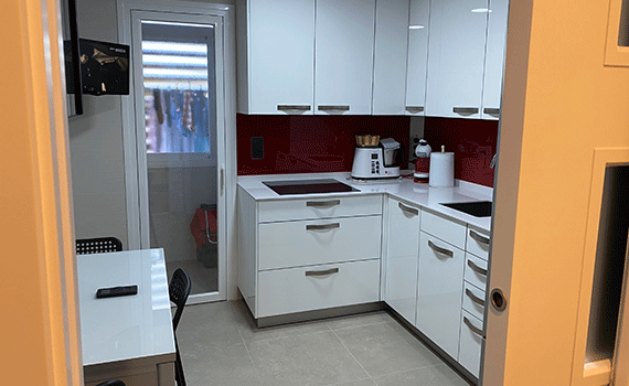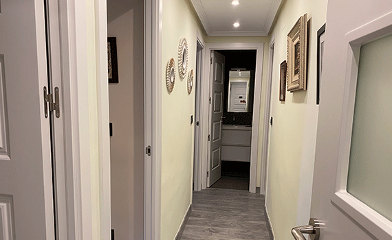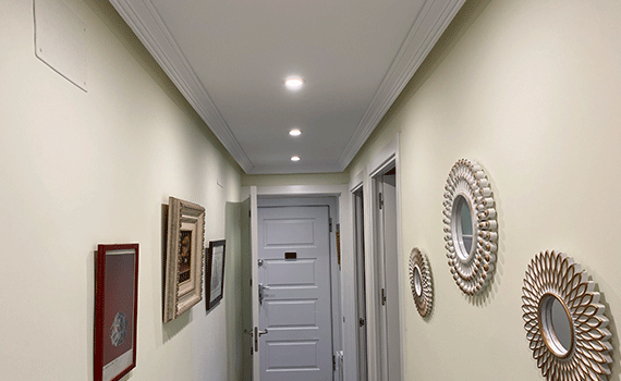 Para finalizar la reforma, se alisaron todas las paredes y techos pues estos estaban realizados con gotelet. Así, en este caso, se cubrió con emplaste de renovación para tapar la gota existente, posteriormente se aplicó una capa de imprimación para conseguir un buen agarre para las paredes y por último, se pintó las paredes y techos de la vivienda.
