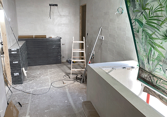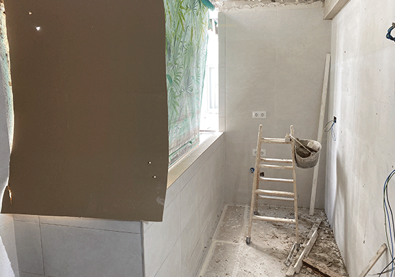 El siguiente paso consistió en alicatar y pavimentar la cocina y cada uno de los baños existentes en la vivienda. Comenzamos los trabajos por la cocina con el objetivo de ganar tiempo para que los muebles de la cocina se pudiesen ir fabricando. Una vez finalizados los trabajos en la cocina se procedió a reformar los dos cuartos de baño.